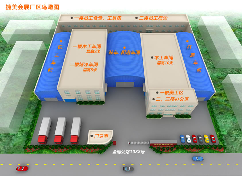 捷美工廠位于上海市奉賢區(qū)金閘路1088號(hào),位于上海國家會(huì)展中心及上海新國際博覽中心中間位置距各大型展館僅需45分鐘車程.工廠占地8000平米,整體區(qū)分為辦公區(qū);展覽制作車間;道具制作車間;鐵藝車間;美 工車間;倉儲(chǔ)庫房;宿舍樓以及食堂.